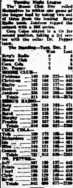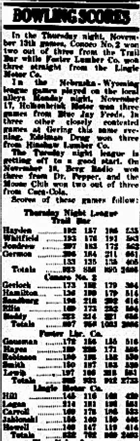 H Erle Reid was president and Richard Rogge was manager of the lanes per the 1931 Ives Wyoming State Business Directory. C J Ide was owner/manager per the 1932 Ives Wyoming State Business Directory. H L Lisle was owner/manager per the 1937 Ives Wyoming State Business Directory. Harley J and Henry W Lisle were owners/managers per the 1939-40 Ives Wyoming State Business Directory. T J Lisle was owner/manager per the 1950 & 1953-54 Rocky Mountain Business Directories (I believe 426 W 19th Ave was T J Lisle's residence). Hernie (Henrie) W Lisle was owner/manager at 1942 Main per the 1955 Rocky Mountain Business Directory. |